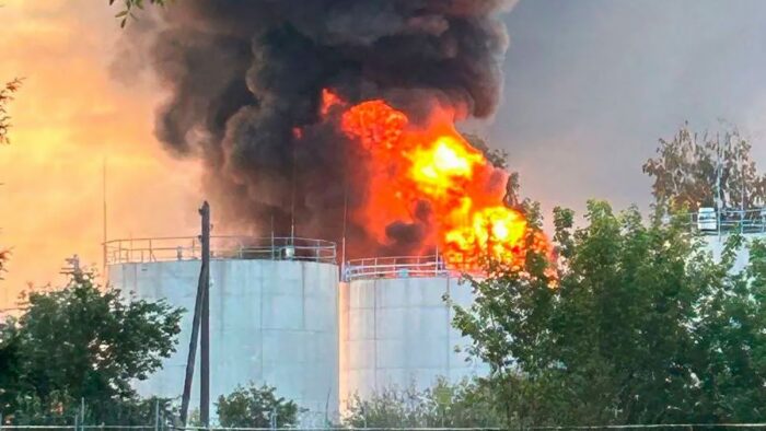 被俄罗斯防空系统摧毁的无人机碎片落在一个油罐上,引起火灾。