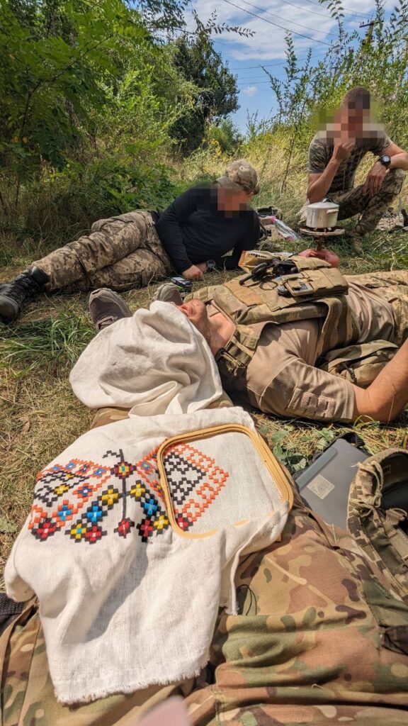 一年前,我们在罗博季涅村附近工作。值班时,在等待去救伤员时,我们坐在地下室里。当情况变得危险时,我们就搬到另一栋房子,搬到另一个地下室。有时我们在灌木丛中执勤。为了消磨时间和冷静下来,因为村子不断遭到炮击,非常可怕,我就在地下室打着电筒,在灌木丛中绣花。我们带走伤员,回到原地后,我就继续刺绣。重要的是要继续创作一些传统的东西,作为我的遗产。